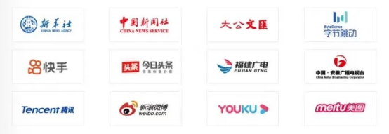 新华社、中新社、大公文汇、字节跳动、快手、今日头条、福建广电、安徽广电、腾讯、新浪、优酷、美图、澳美广告、比亚迪、中国邮政集团有限公司、中建四局建设发展有限公司、厦门广播电视集团、中国南方航空集团有限公司、广东省广告集团股份有限公司、中国银行股份有限公司、泉州晚报社、中国共产党镇江市委员会党校、咪咕动漫有限公司、上海大智慧财汇数据科技有限公司、招商银行股份有限公司厦门分行、国家税务总局无极县税务局、新华报业传媒集团、央视国际网络无锡有限公司、中交广州航道局有限公司、上海博伽文化传媒有限公司等。