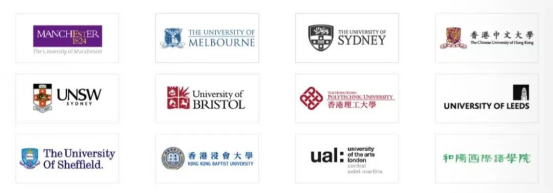 英国曼彻斯特大学、澳大利亚墨尔本大学、澳大利亚悉尼大学、香港中文大学、澳大利亚新南威尔士大学、英国布里斯托大学、香港理工大学、英国利兹大学、英国谢菲尔德大学、香港浸会大学、英国伦敦艺术大学、日本和阳国际语学院等。