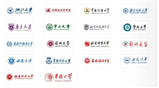 浙江大学、中国社会科学院、中国传媒大学、北京师范大学、南京大学、中山大学、北京外国语大学、暨南大学、上海外国语大学、深圳大学、北京体育大学、郑州大学、西南大学、华南师范大学、西南政法大学、安徽大学、福建师范大学、华侨大学等。